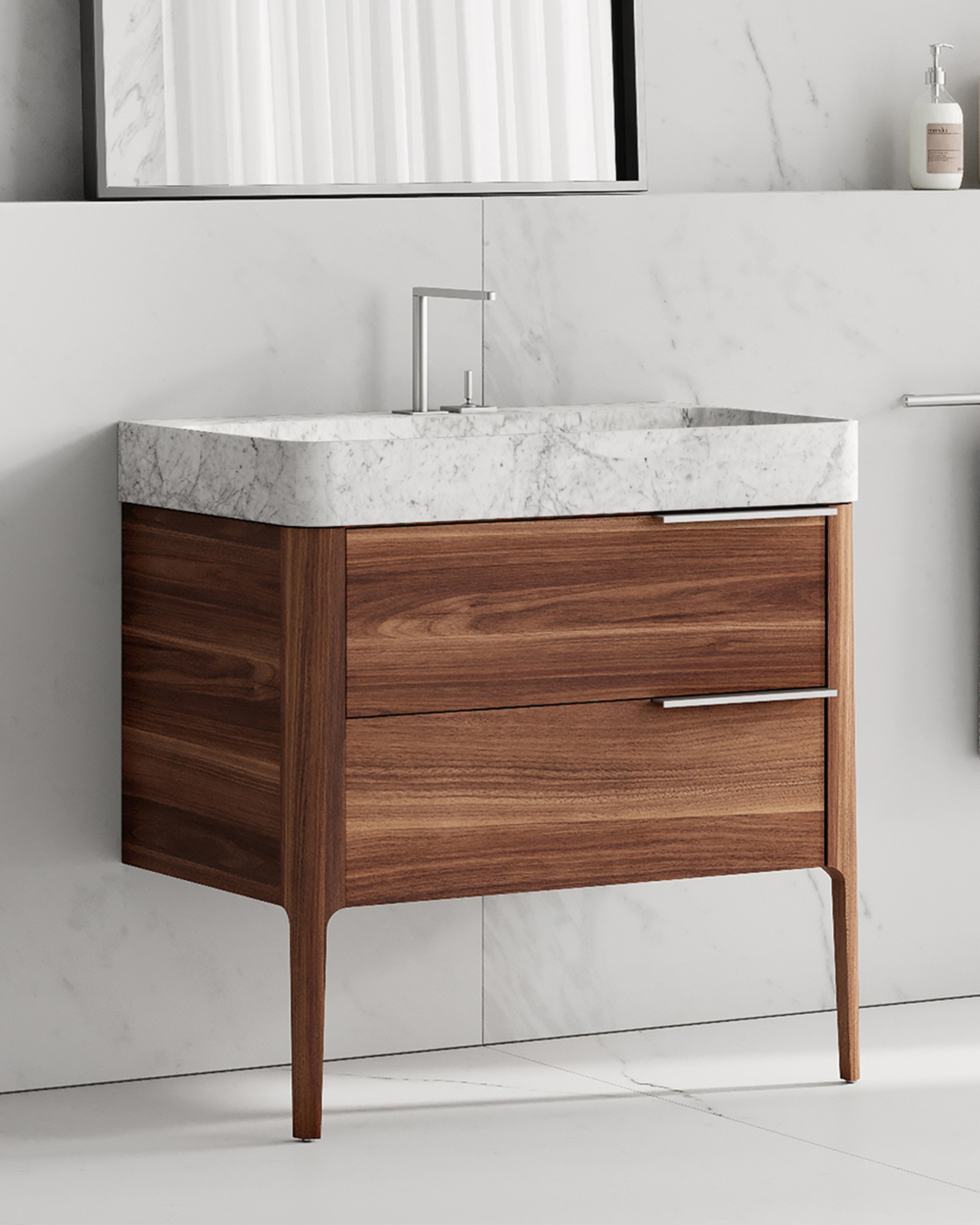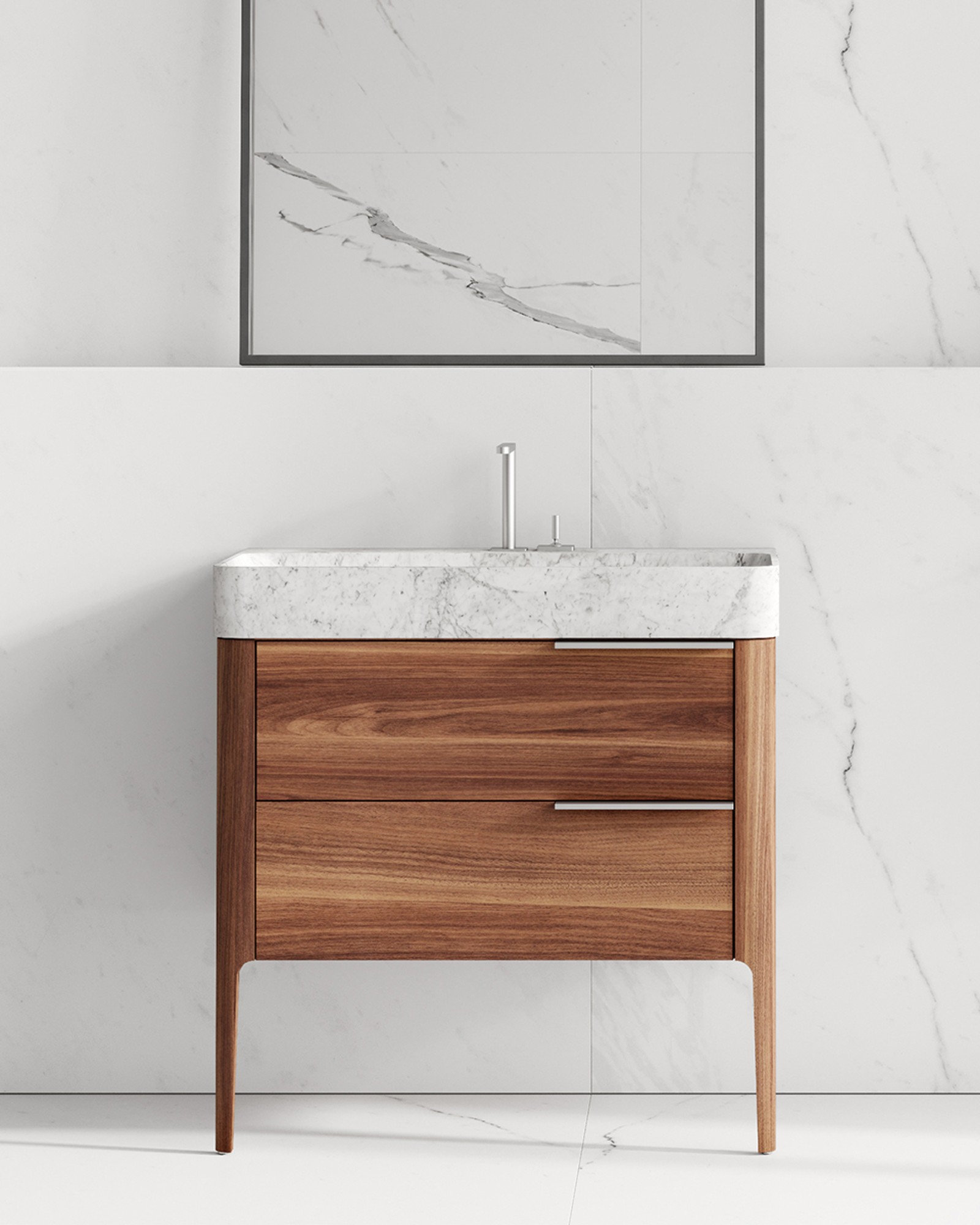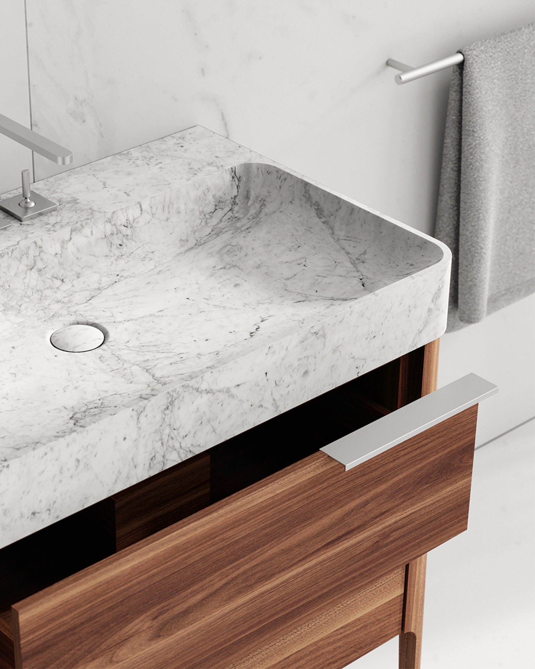 Carrara marble shows natural differences in veining, colour, and texture that are inherent to its geological background. Walnut exhibits natural variations in grain and tone. Each piece is unique. Images are representative.